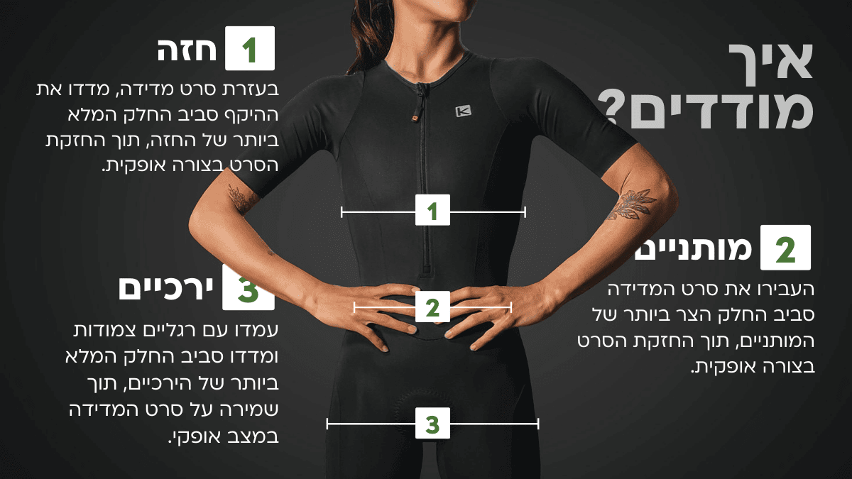 | מידה | חזה (A) | מותן (B) | ירכיים (C) |