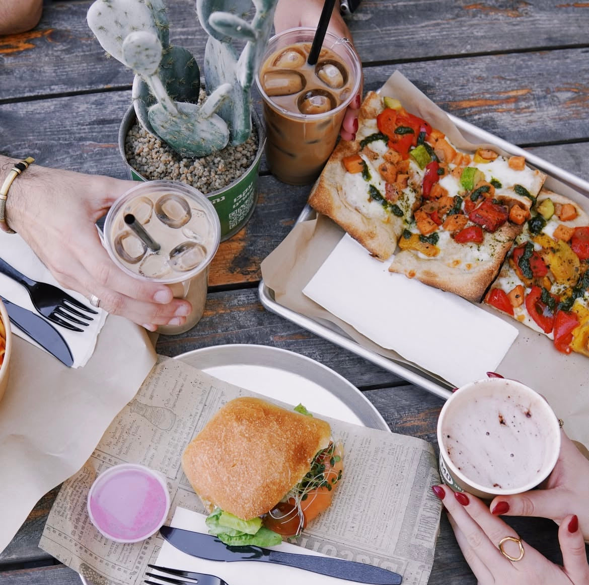 בתפריט הקבוע: פוקאצ'ות, כריכים, סלטים, טוסטים, קיש, לזניה ומנות משתנות.